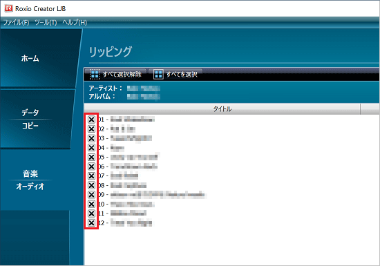 - 表示された音楽の一覧から、パソコンに取り込まない音楽のチェックボックスをクリックし、チェックを外します。