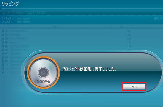 - 取り込みが完了すると、ディスクトレイが開き(または、ディスクが排出され)「すべてのトラックのリッピングが成功しました。」と表示されます。