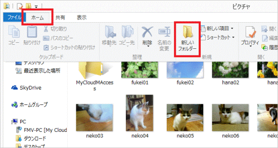 「ホーム」タブの「新しいフォルダー」をクリックします。