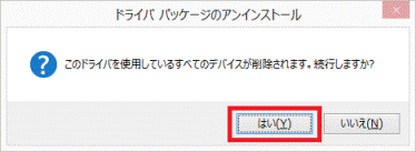 - 「このドライバを使用しているすべてのデバイスが削除されます。続行しますか?」と表示されます。