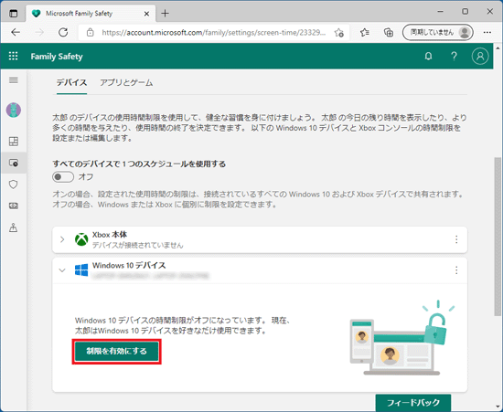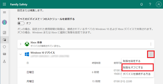 アドバイス設定した時間制限をオフにする場合は、「Windows 10デバイス」の「