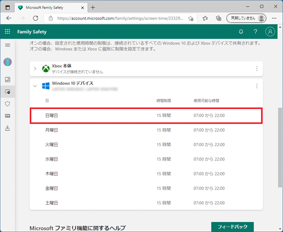 マイクロソフト社のホームページで、子どもがパソコンを使用できる時間を設定します。