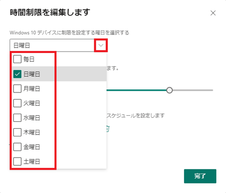 - 1日あたりの使用時間を変更する場合は、「それらを使用できる期間の制限時間を選択します。」のスライダー部分をクリックして「〇」をお好みの位置に移動します。