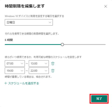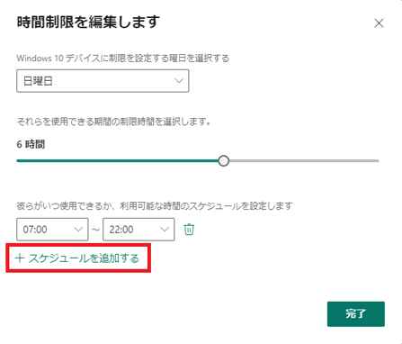 - 使用できる時間を変更する場合は、「彼らがいつ使用できるか、利用可能な時間のスケジュールを設定します」の開始時間と終了時間を設定します。