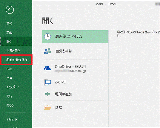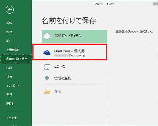 「名前を付けて保存」を実行して、保存先にOneDriveを選択します。