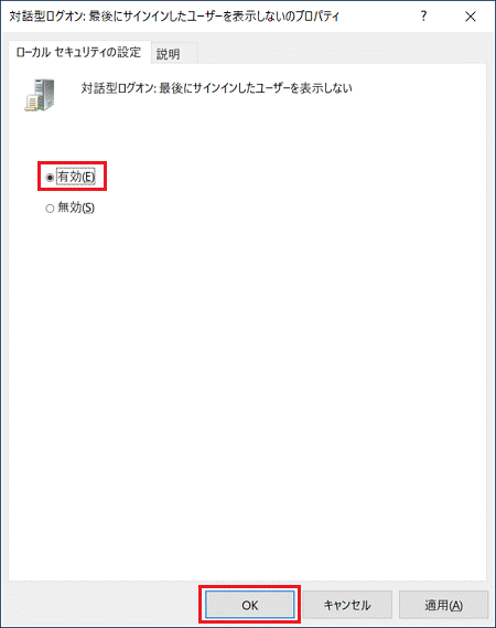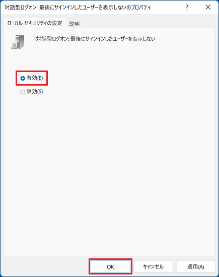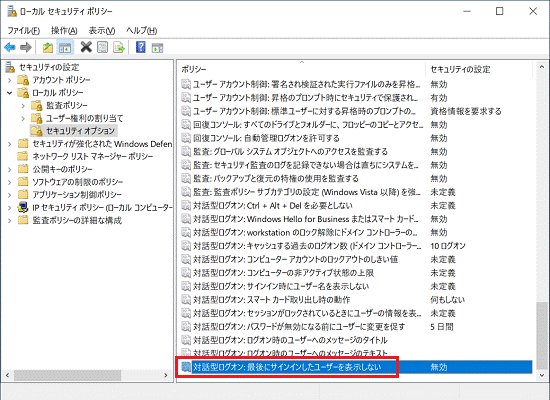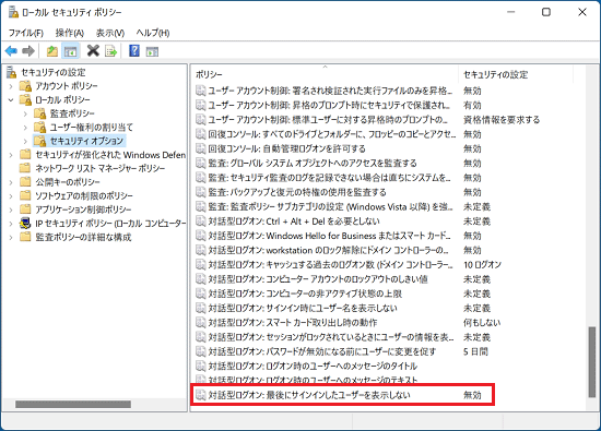 - 対話型ログオン:最後にサインインしたユーザーを表示しない