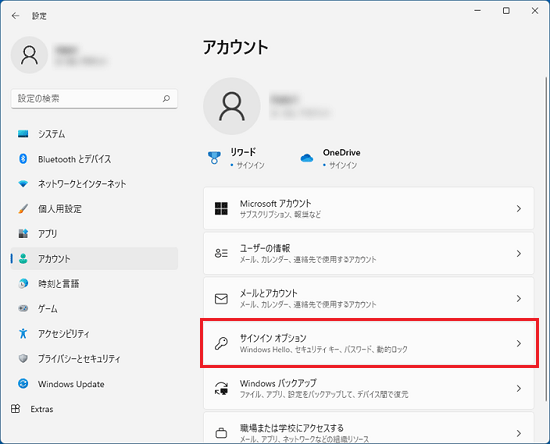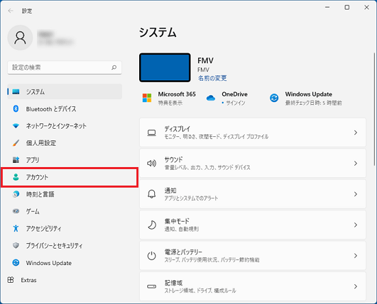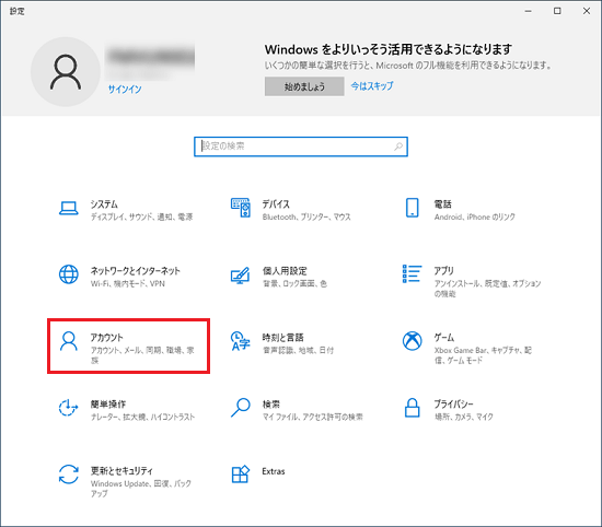 アドバイス「アカウント」が表示されていない場合は、「設定」の左にある「