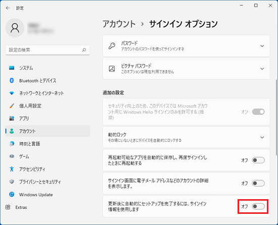 画面を下にスクロールし、「更新後に自動的にセットアップを完了するには、サインイン情報を使用します」のスイッチをクリックしてオフにします。