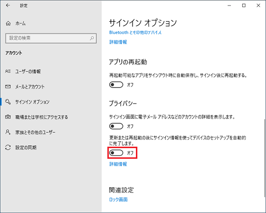 画面を下にスクロールし、「更新または再起動の後にサインイン情報を使ってデバイスのセットアップを自動的に完了します」のスイッチをクリックしてオフにします。