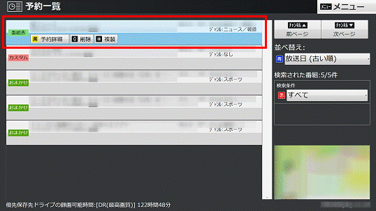 アドバイス「青」ボタンや「赤」ボタンで、予約録画を並べ替えたり、検索条件に一致した予約録画のみを表示したりできます。