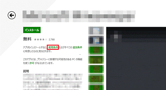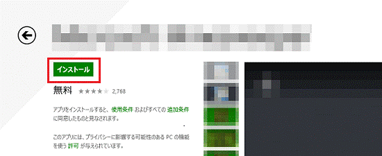 [Windows 8.1/8] Windows ストア アプリをアップデートする方法を教えてください。 - 使用条件に同意するときは、「インストール」または「購入」をクリックします。