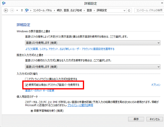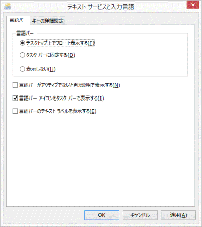 「使用可能な場合にデスクトップ言語バーを使用する」クリックしてチェックを付けます。 - 言語バーを非表示にする