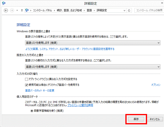 - 「入力方式の切り替え」欄にある「使用可能な場合にデスクトップ言語バーを使用する」の状態を確認し、必要に応じてチェックをクリックします。