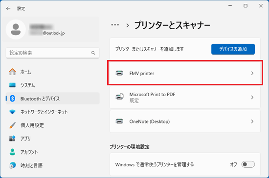 通常使うプリンターを変更したいときは、設定アプリの「Bluetooth とデバイス」で指定します。