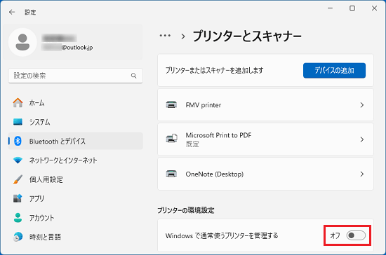 - 「プリンターの環境設定」にある、「Windows で通常使うプリンターを管理する」のスイッチをクリックし、「オフ」にします。