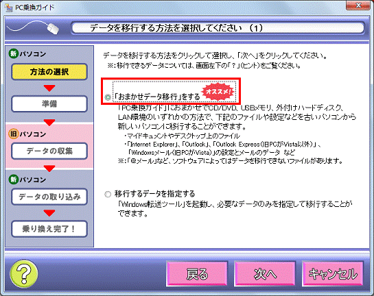 - 「データを移行する方法を選択してください(1)」と表示されます。