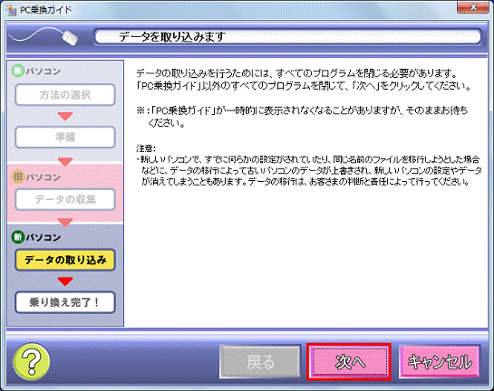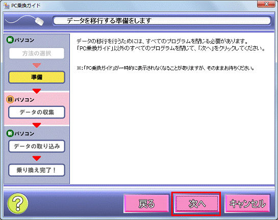 「PC乗換ガイド」以外のプログラムをすべて閉じ、「次へ」ボタンをクリックします。