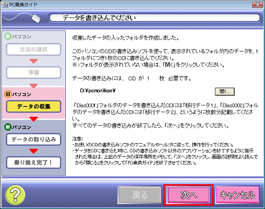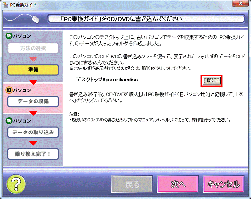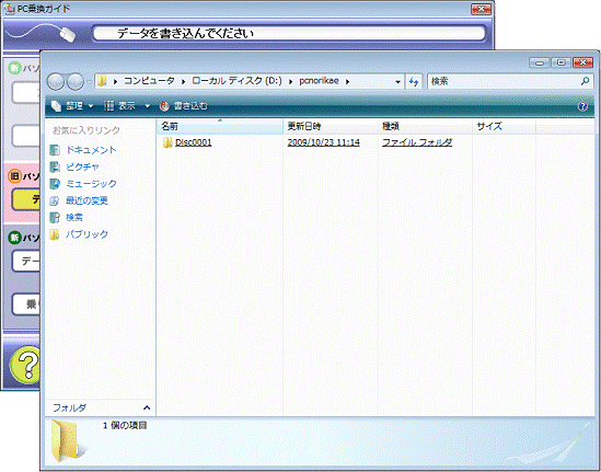 - 「「PC乗換ガイド」をCD/DVDに書き込んでください」と表示され、同時に「pcnorikaedisc」フォルダーが開きます。
