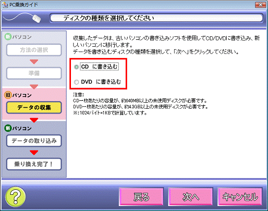 古いパソコンでデータを書き込むCD/DVDに応じて、「CD に書き込む」または「DVD に書き込む」をクリックします。