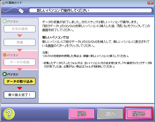 - 新しいパソコンに、「古いパソコンで、移行するデータを収集する」で移行するデータを書き込んだCD/DVDをセットします。