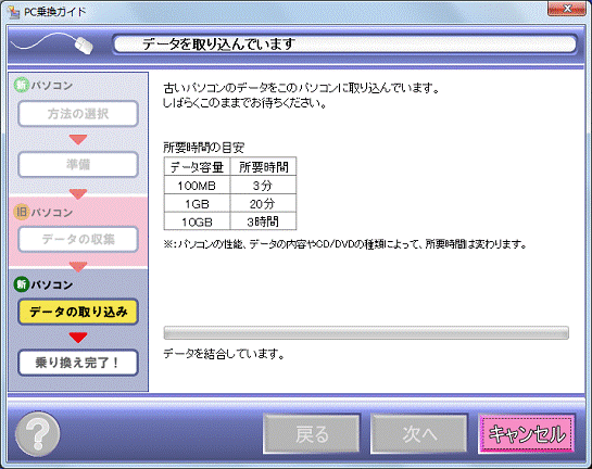 - 「PC乗換ガイド」に「データを取り込みます」と表示されます。