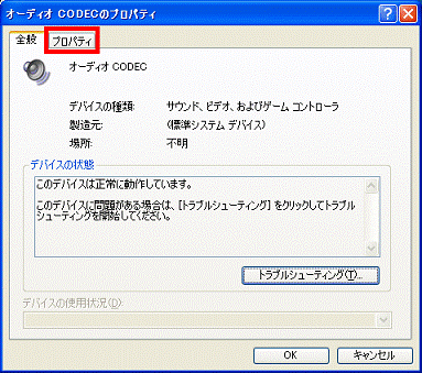 ここでは例として、「オーディオ CODEC」をクリックし、「プロパティ」ボタンをクリックします。
