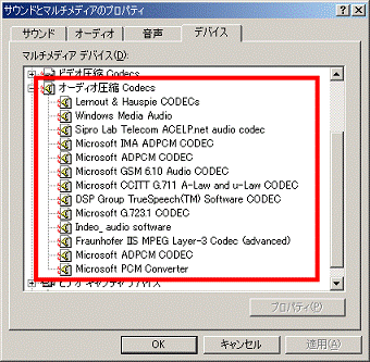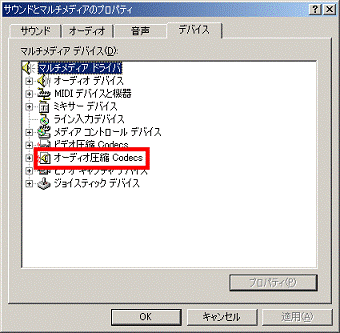 - 「デバイス」の一覧から「オーディオ CODEC」または「ビデオ CODEC」をクリックし、「プロパティ」ボタンをクリックします。