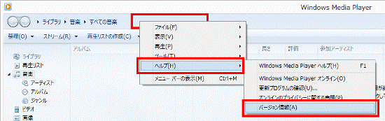 「ライブラリ」や「音楽」などが表示されているバーの何もないところを右クリックし、表示されるメニューから「ヘルプ」→「バージョン情報」の順にクリックします。