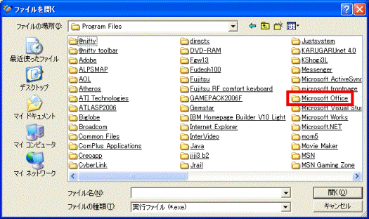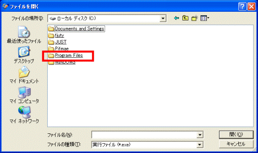 「ファイルの場所」の「▼」ボタンをクリックし、表示される一覧から「ローカルディスク (C:)」をクリックします。 - 「Program Files」フォルダをクリックします。