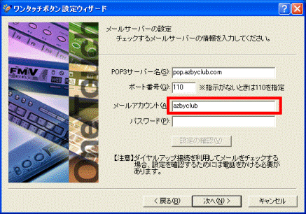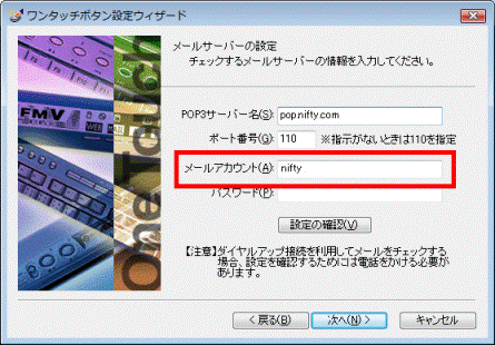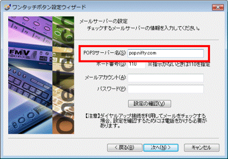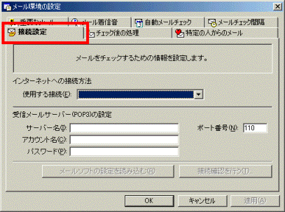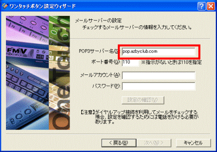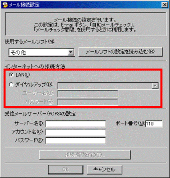 「ダイヤルアップ」をクリックした場合は、「ユーザー名」欄と「パスワード」欄も入力します。 - 「受信メールサーバー(POP3)の設定」の「サーバー名」欄に、Outlookで設定されている受信メールサーバー名を入力します。