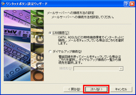 「ダイヤルアップ接続」をクリックした場合は「接続先」欄も選択します。 - 「次へ」ボタンをクリックします。
