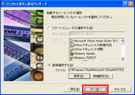次の手順で、ワンタッチボタンの「メール」ボタン(または「E-mail」ボタンなど)を押したときに、Outlook 2000、Outlook 2002でメールをチェックするための設定をします。