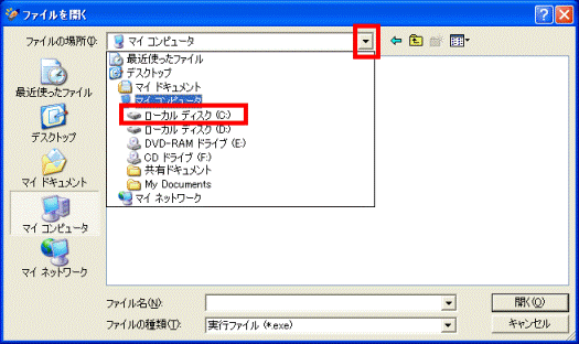 - 「ファイルの場所」の「▼」ボタンをクリックし、表示される一覧から「C:」をクリックします。