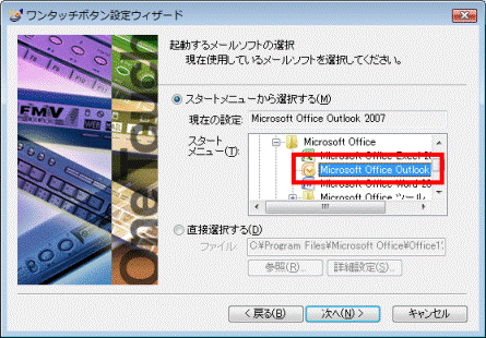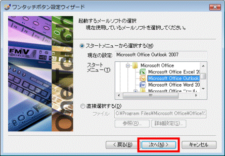次の手順で、ワンタッチボタンの「メール」ボタン(または「Mail」ボタンなど)を押したときに、Outlook 2007でメールをチェックするための設定をします。