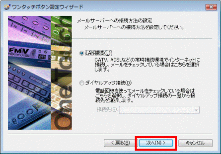「ダイヤルアップ接続」をクリックした場合は、「接続先」も選択します。 - 「次へ」ボタンをクリックします。