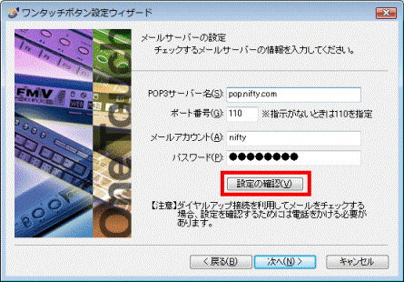 - 「設定の確認」ボタンをクリックし、設定した内容でメールサーバーに接続できるかどうかを確認します。