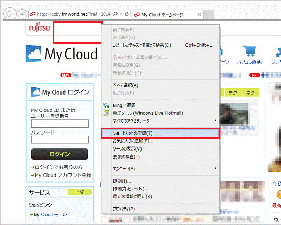 そのため、ショートカットアイコンを使ってそのページを開くと、正しく表示されない場合があります。 - メニューに「ショートカットの作成」が表示されない場合は、右クリックする場所を変えてから、もう一度手順3.を操作してください。
