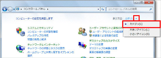 - 右上の表示方法の「▼」をクリックし、表示されるメニューから「カテゴリ」をクリックします。