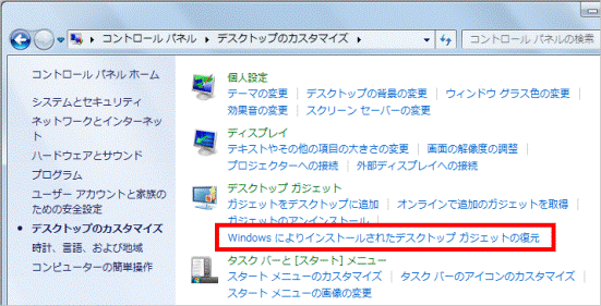 - 「Windows によりインストールされたデスクトップガジェットの復元」をクリックします。