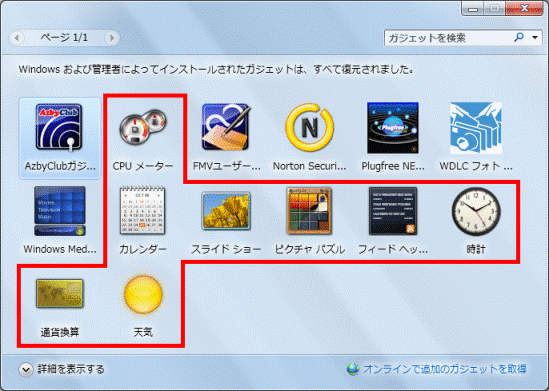 削除していたWindows 7標準のガジェットがすべて復元されていることを確認します。