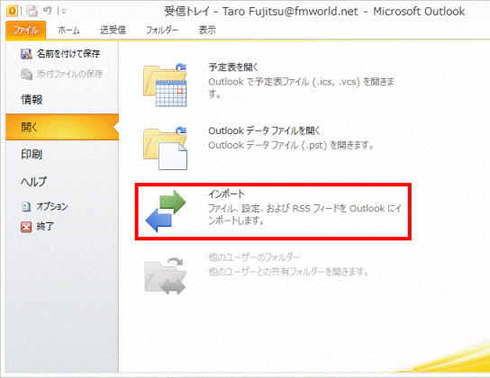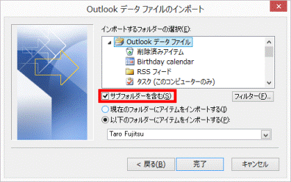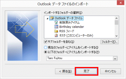 - 「Outlook データ ファイルのインポート」が表示されます。