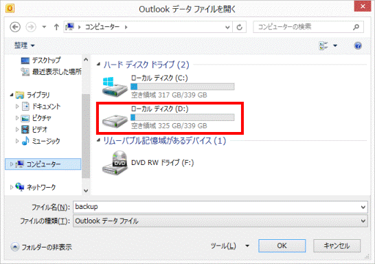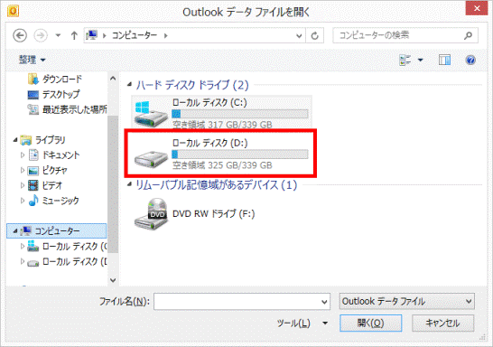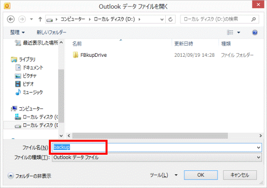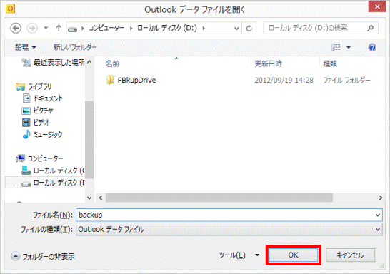 - 「Outlook データ ファイルを開く」が表示されます。