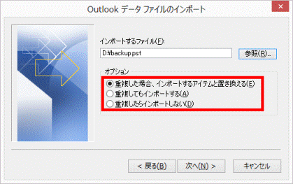 既存のデータは上書きされず、重複する情報が現在のOutlookフォルダーに追加されます。 - 重複したらインポートしない