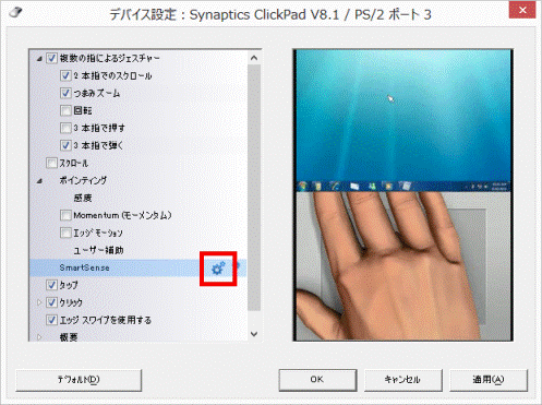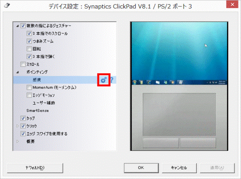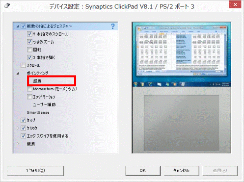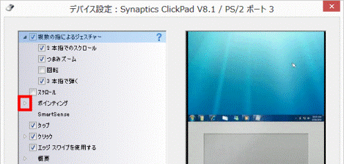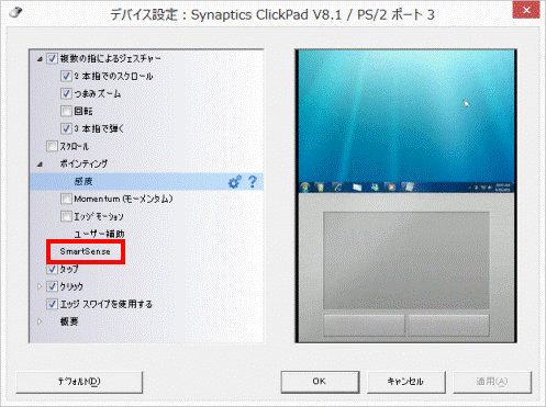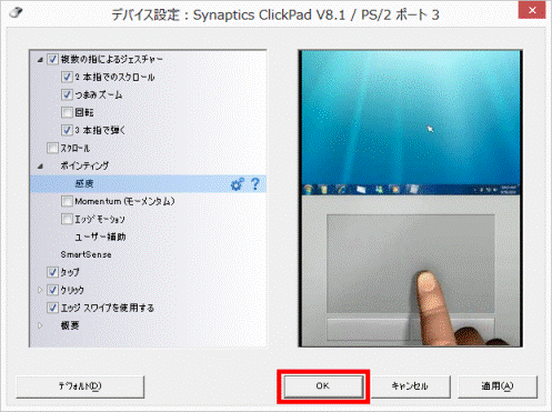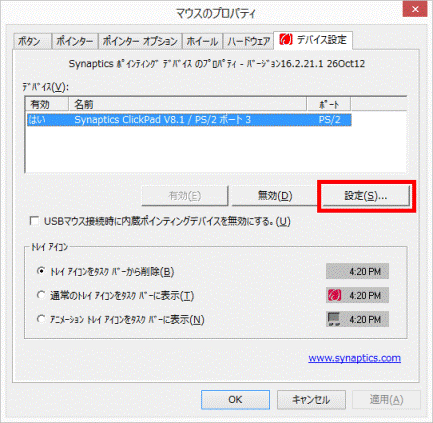 - 「デバイス」欄の「Synaptics ClickPad」または「Synaptics TouchPad」をクリックします。