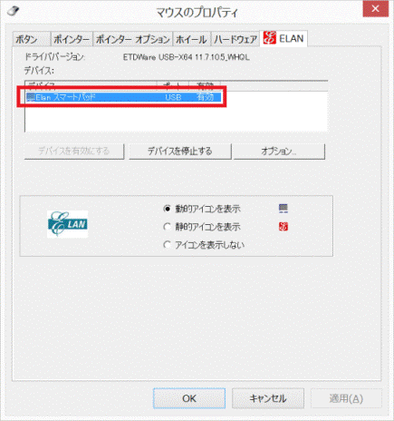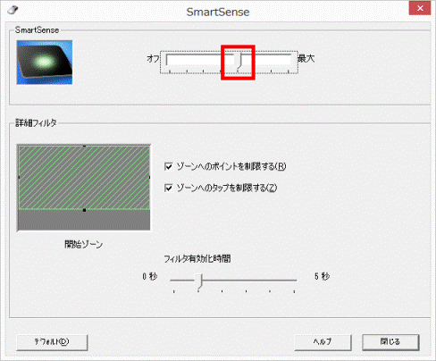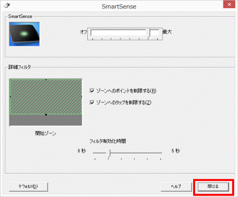 SmartSenseは、一定時間操作しないとき、フラットポイントの動作を一時的に停止する機能です。 - 「閉じる」ボタンをクリックします。