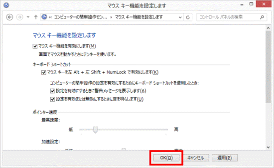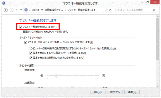 マウスキー機能とは、マウスの代わりにキーボードのテンキーを使用して、マウスポインターを移動する機能です。