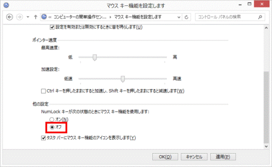 - 「NumLockキーが次の状態のときにマウスキー機能を使用します」の「オフ」をクリックします。