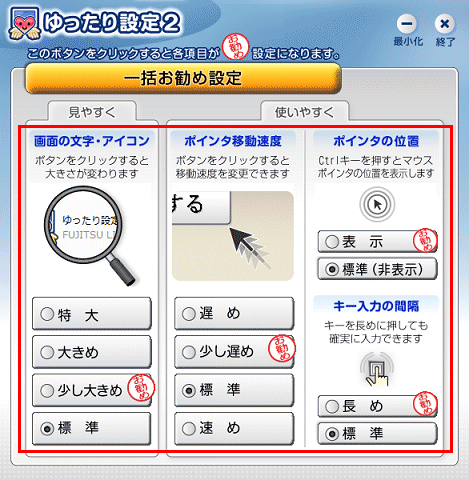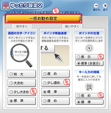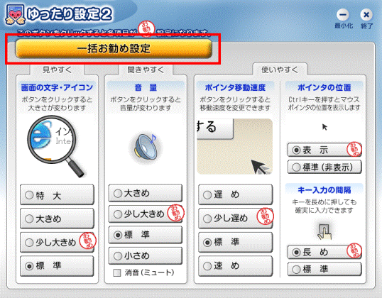 ゆったり設定2で設定できる項目を、まとめてお勧めの状態に変更します。