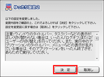 - 「「ゆったり設定2」は、画面の設定を変更する際に、アイコンを整列します。」と表示されたときは、デスクトップのアイコンが並び替えられても問題がないことを確認します。
