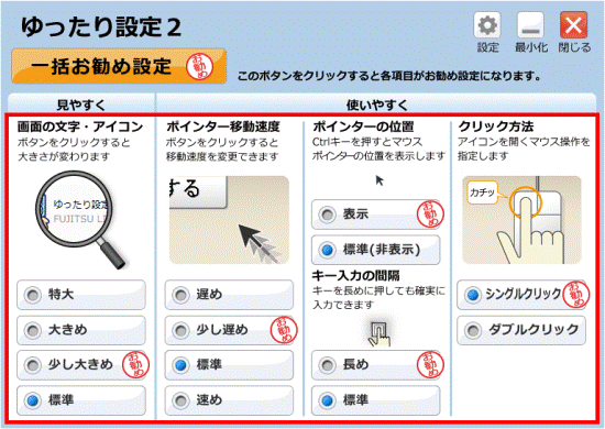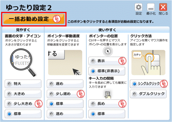 - 「一括お勧め設定」ボタンをクリックすると、各項目の「お勧め」と表示された設定に変更されます。
